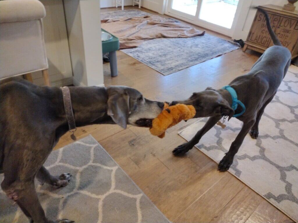 I have 2 Dane foster fur siblings and I have no fear being around them but sometimes my energy gets to be a bit much for them and they let me know to back off and typically I will listen to that cue. I am also working on my manners; I know sit, come and let go but still need some reminders as I am after all still all puppy. My foster mom has also taught me to walk on a leash and I do pretty well but then sometimes there are leaves and things on the ground that call me to pull in a different direction. Overall, I’m a really good puppy and I try to be a good girl and I do take redirection when needed.