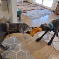 So here’s what me and foster mom think my perfect forever family would be: – One or two fur siblings to play with who are medium to large dogs. I’ve only met another dane through a fence, and he didn’t really like me, so I didn’t get to try to play with him. – A calmer home that is willing to keep working with me on meeting new people as I learn that I will be protected and people will be nice to me. – No little kids – I just don’t understand the difference between my 158 lbs and little kids a fraction of my size. I’ll want to play with them and mom thinks they will be squished.